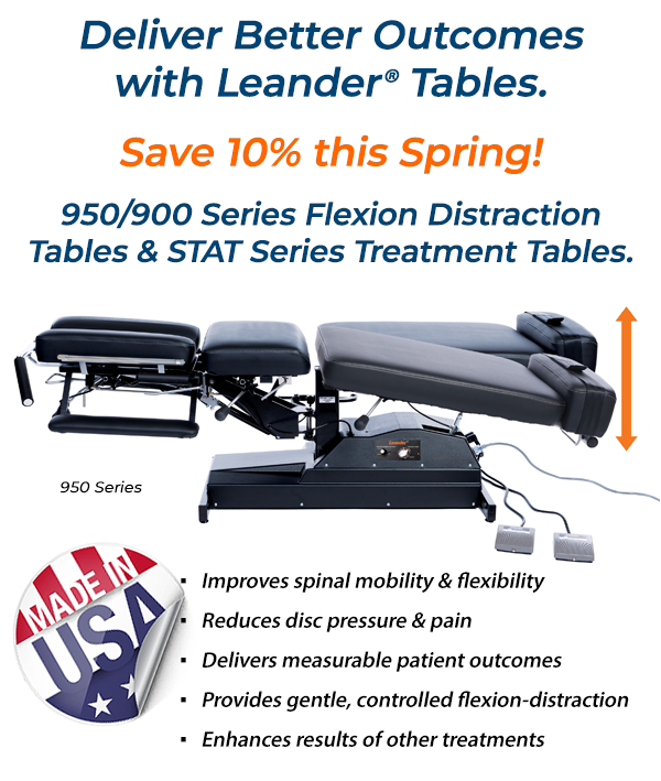 Leander’s motorized flexion distraction system delivers smooth, controlled motion that reduces the force required for spinal adjustments—enhancing patient comfort while helping protect the chiropractor’s own spinal health.